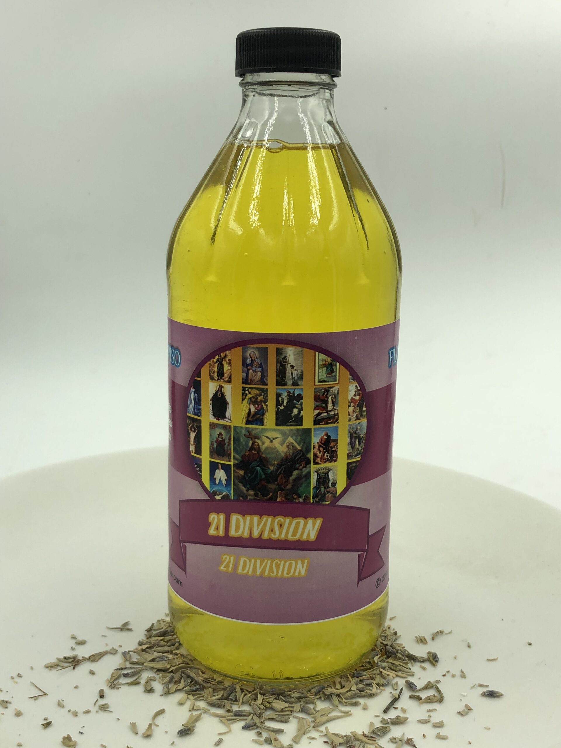 Con el lavado de piso 21 Division puede ser usado para invocar la ayuda de 21 santos al mismo tiempo para tener protección, prosperidad, amor, y exito. Mezclar una parte con agua tibia y trapear el piso de adentro hacia afuera. El color puede ser diferente al de la imagen.
