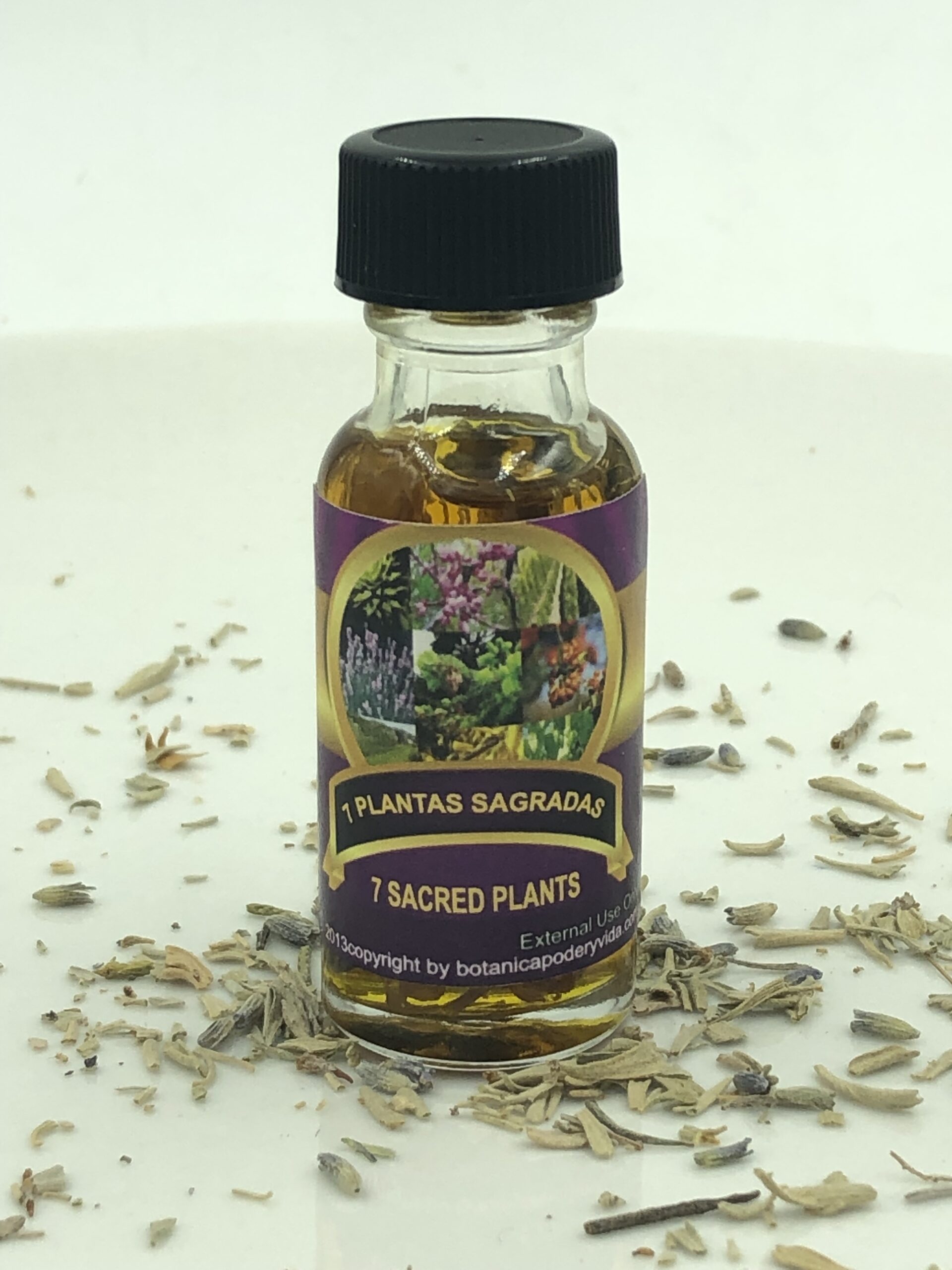 El aceite espiritual 7 Plantas Sagradas es hecho a base de 7 poderosas plantas que te pueden ayudar a liberarte de energías negativas, envidias, malas vibras y mucho más. Usarlo externamente en el cuerpo, también puede ser usado para preparar velas y trabajos espirituales. El color puede ser diferente al de la imagen.