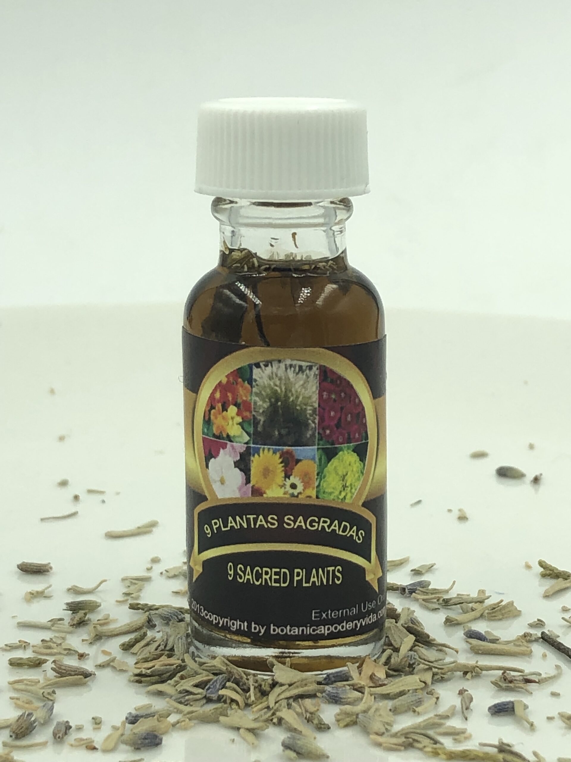 9 Sacred Plants Oil is a blend of 9 powerful herbs. It can be used to help clear your surroundings of negativity and bad energies and help bring good luck. Apply it on the body or use it to fix candles or spells. For external use only. The color may be different from the image.