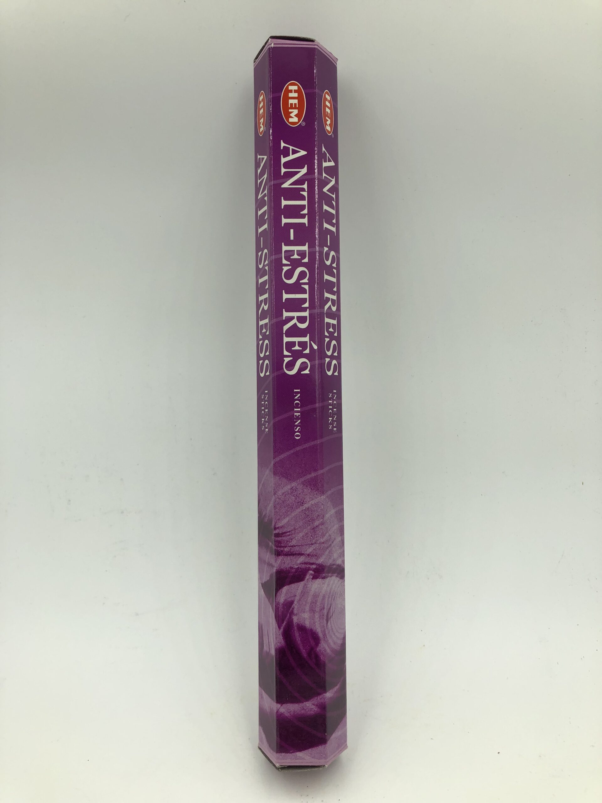 Caja de 20 varillas de incienso de Anti-Estrés. Asegúrese que las cenizas caigan sobre superficies resistentes al fuego (ceniceros o porta-incienso). Mantenlo alejado de niños.