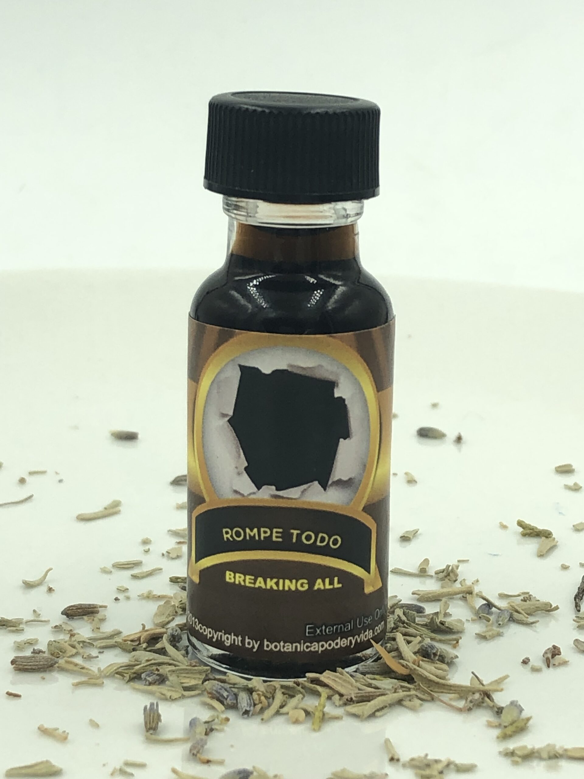 El aceite espiritual Rompe Todo puede ser usado para destruir cualquier cosa que te está afectando negativamente en tu vida. Usarlo externamente en el cuerpo, también puede ser usado para preparar velas y trabajos espirituales. El color puede ser diferente al de la imagen.