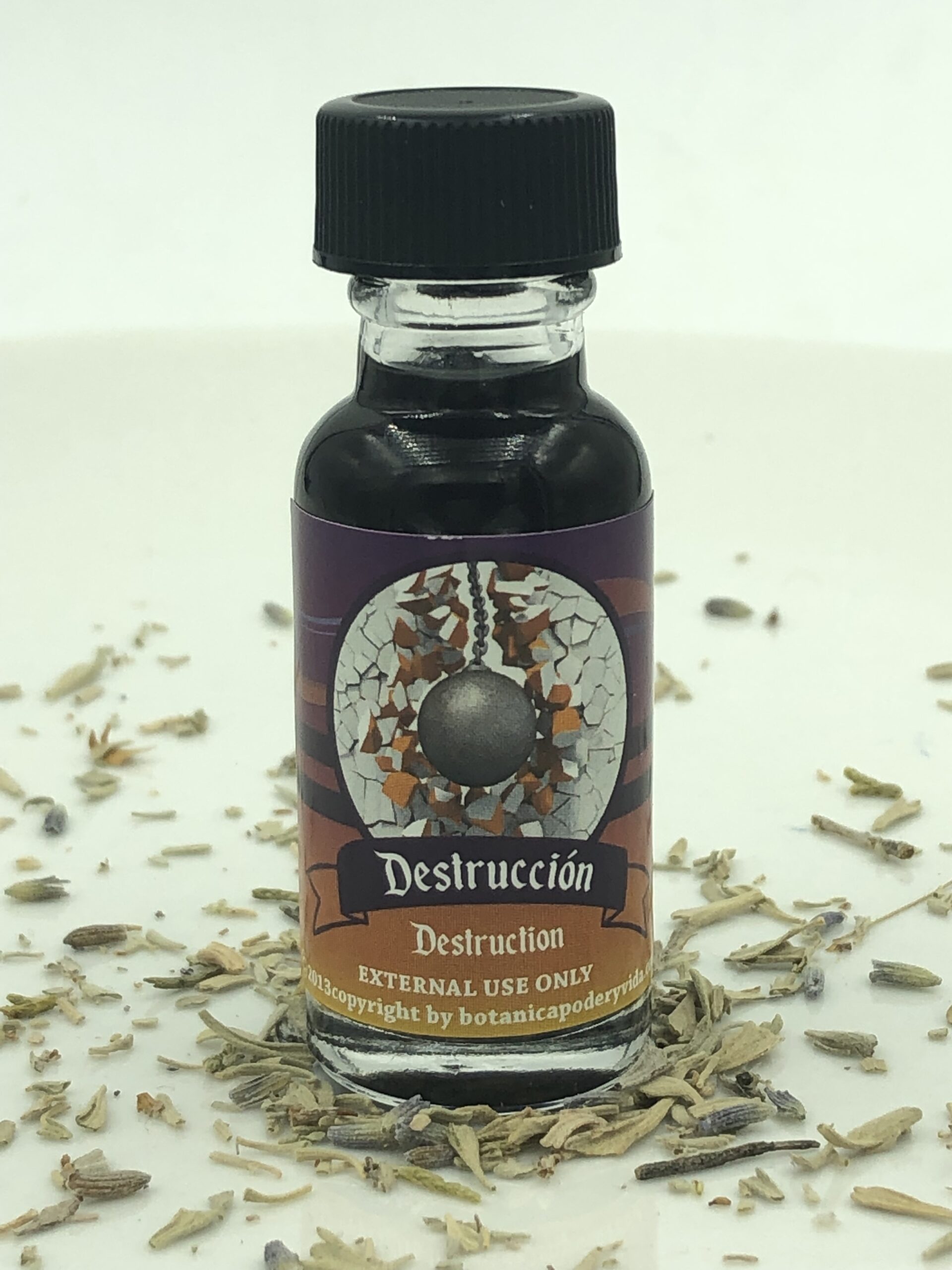 El aceite espiritual Destrucción puede ser usado contra enemigos y apollo para destruir trabajos o hechizos. Usarlo externamente en el cuerpo, también puede ser usado para preparar velas y trabajos espirituales. El color puede ser diferente al de la imagen.