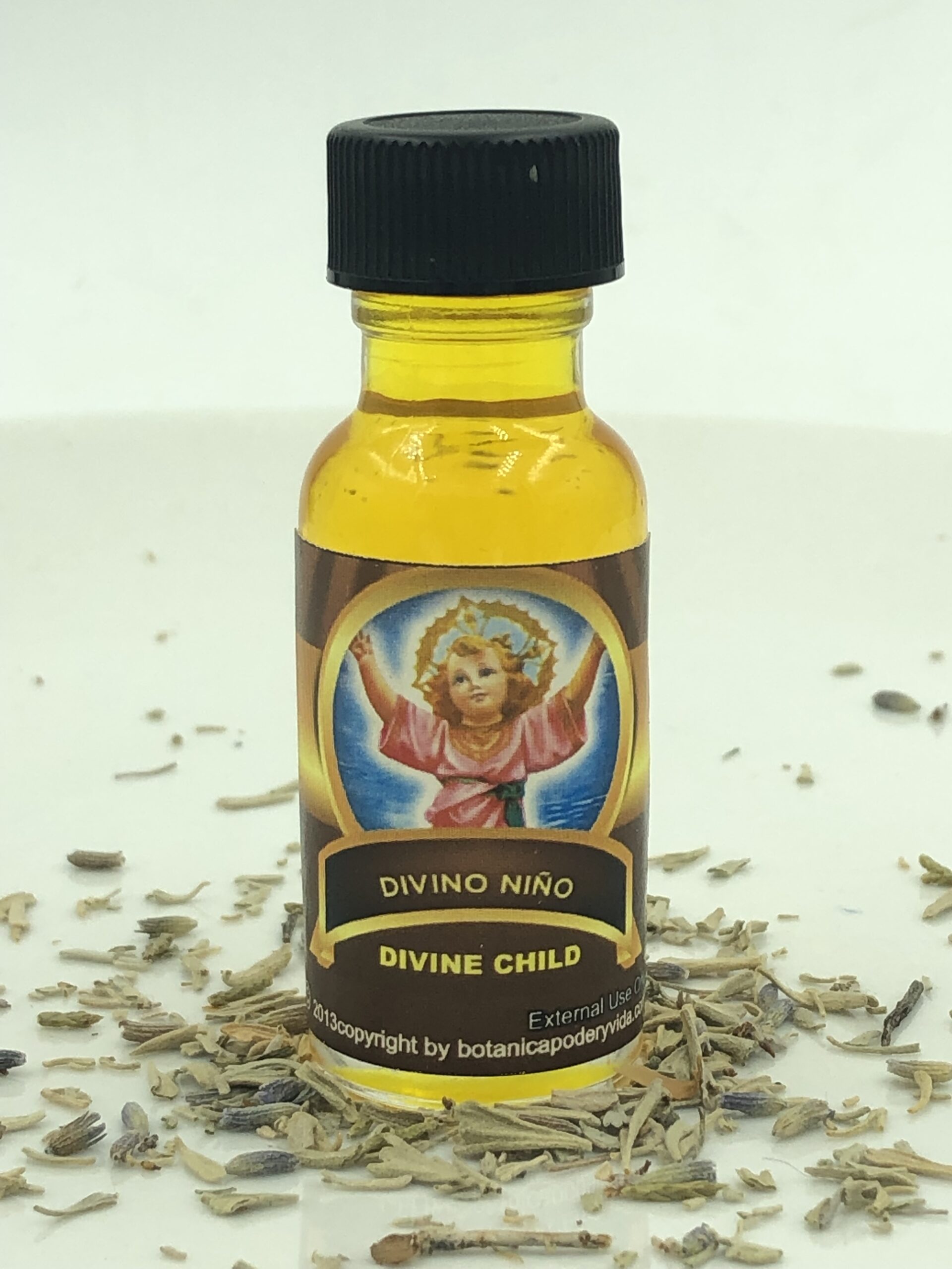 El aceite espiritual Divino Niño puede ser usado para que pidas ayuda en lo que necesites y le de protección a tus niños. Usarlo externamente en el cuerpo, también puede ser usado para preparar velas y trabajos espirituales. El color puede ser diferente al de la imagen.