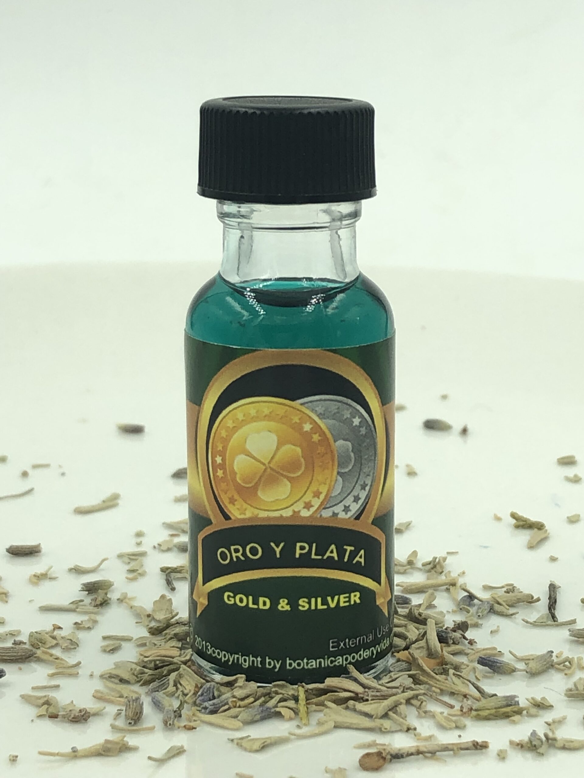 El aceite espiritual Oro y Plata puede ser usado para atraer abundancia y riqueza para que nunca te falte el dinero. Usarlo externamente en el cuerpo, también puede ser usado para preparar velas y trabajos espirituales. El color puede ser diferente al de la imagen.