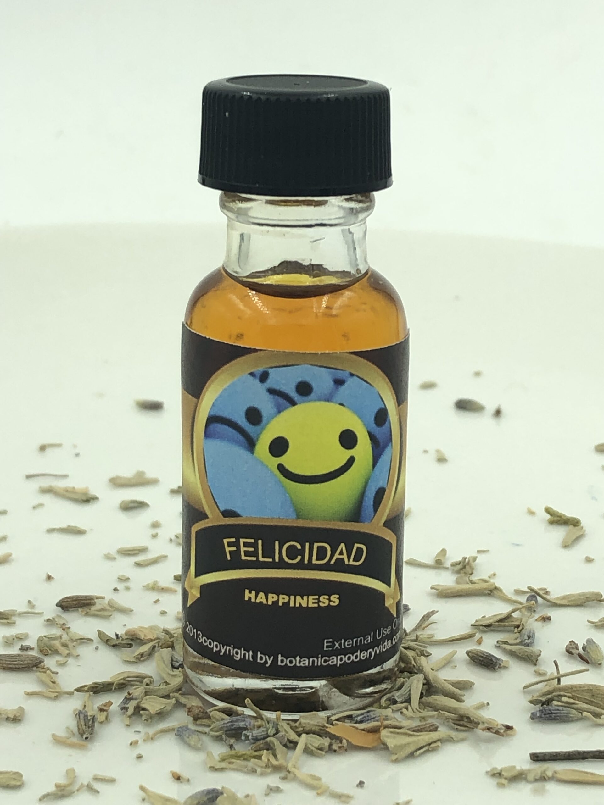 El aceite espiritual Felicidad puede ser usado para ayudarte a conseguir esa alegría que has perdido por problemas personales y ayudarte a resolver los problemas con más positivismo. Usarlo externamente en el cuerpo, también puede ser usado para preparar velas. El color puede ser diferente al de la imagen.