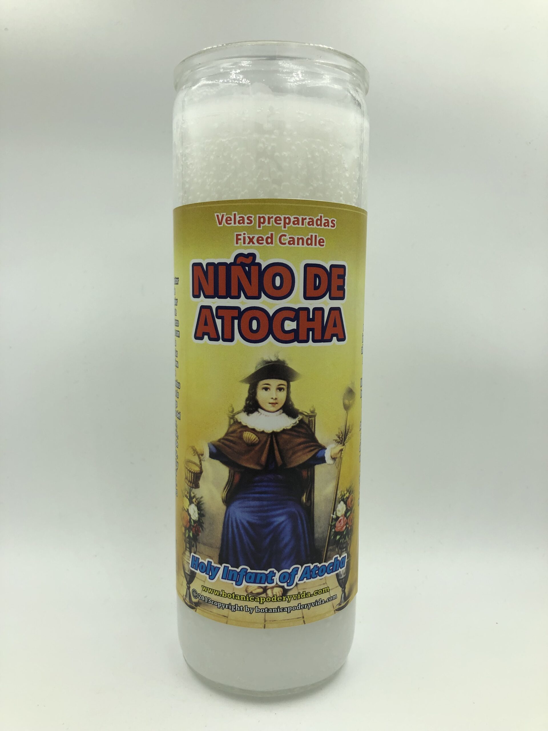 Vela de 7 días para invocar la ayuda de el Niño de Atocha. Haz tu petición con mucha fe. Nunca dejar una vela desatendida.