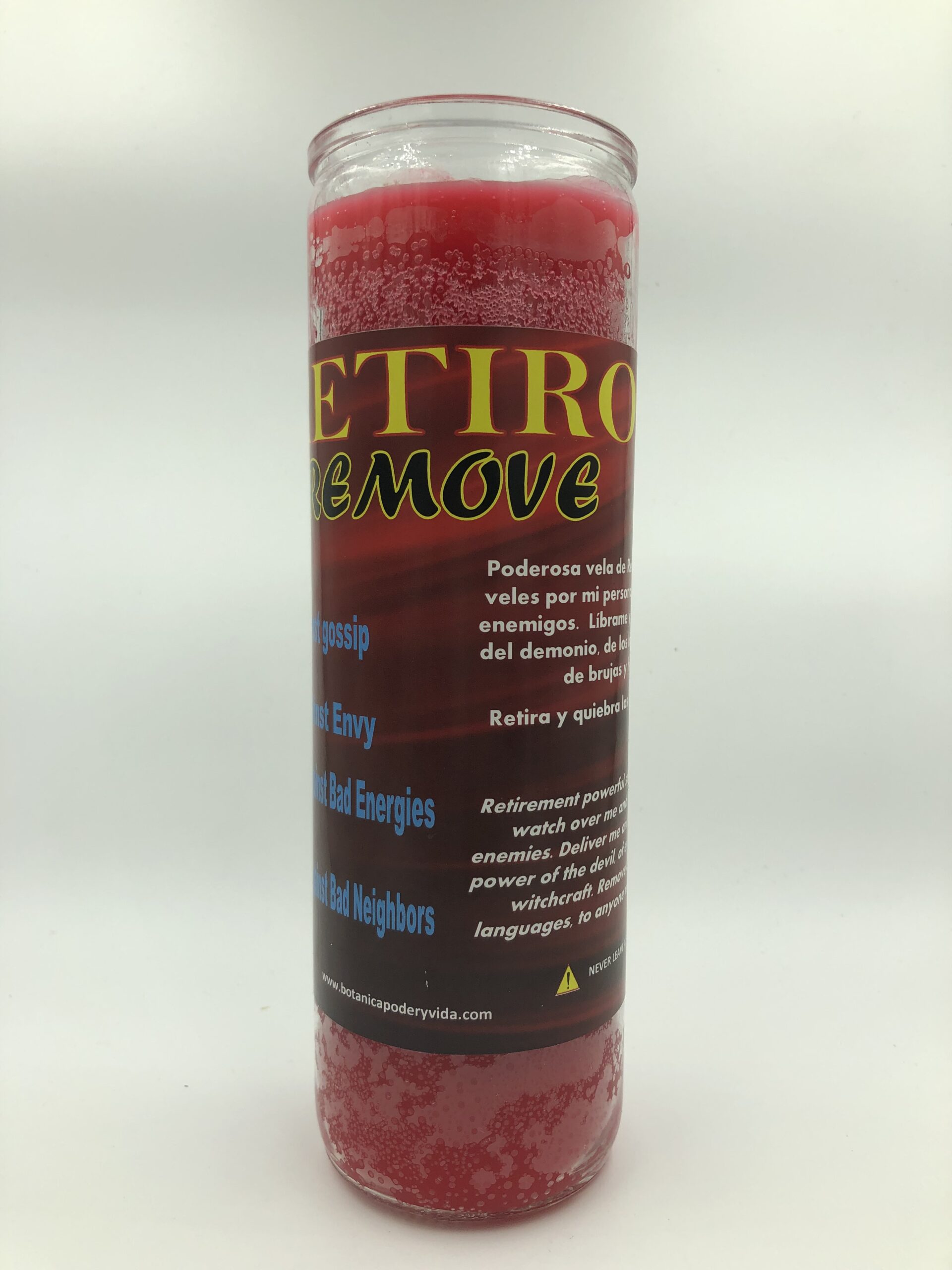 La vela de 7 días Retiro puede ser usado para alejar personas indeseables y que te quieren hacer daño. Haz tu petición con mucha fe. Nunca dejar una vela desatendida.