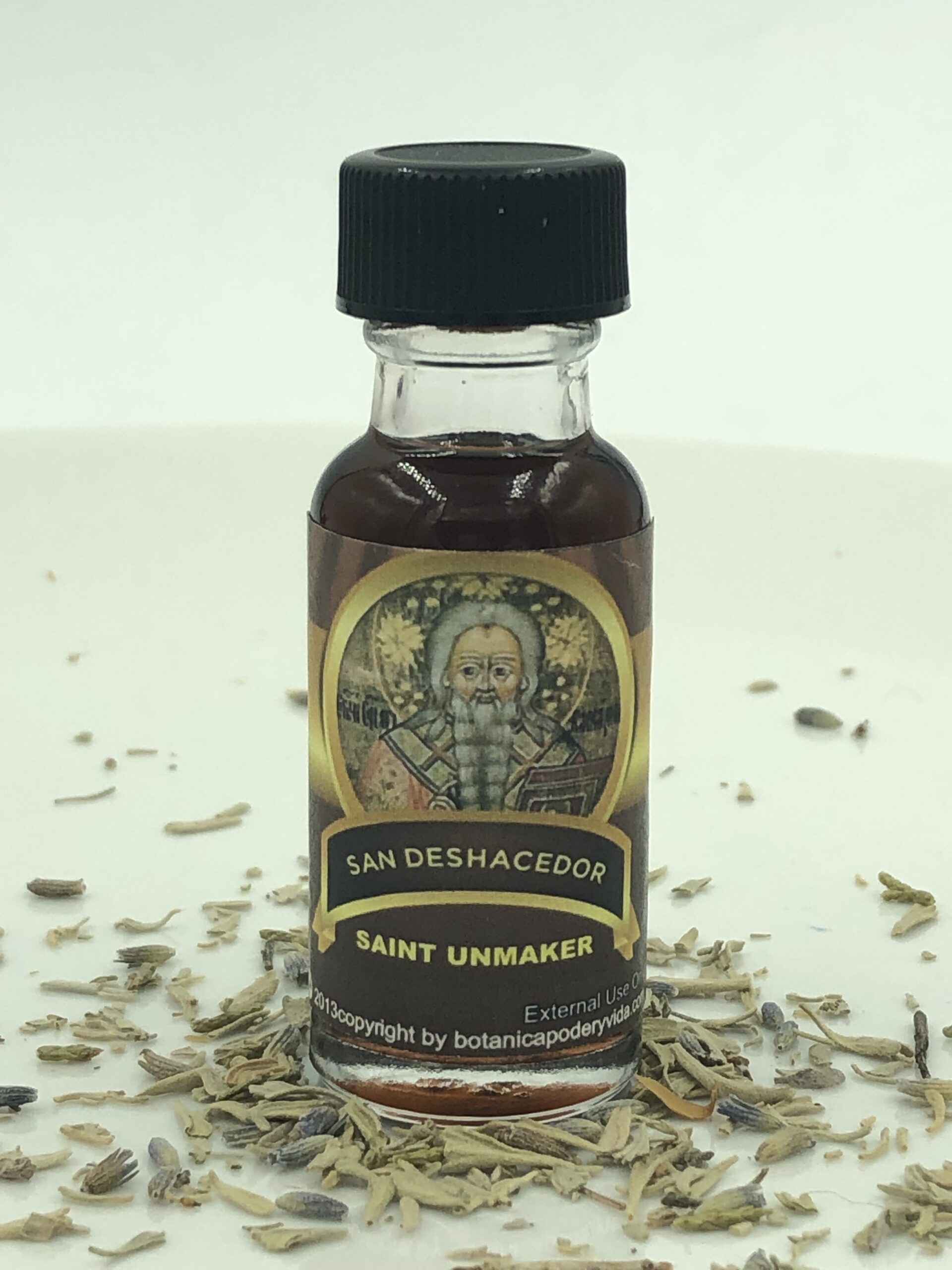 San Deshacedor Oil can be used to invoke his power. He can help you undo or revoke curses and spells. Apply it on the body or use it to fix candles or spells. For external use only. The color may be different from the image.